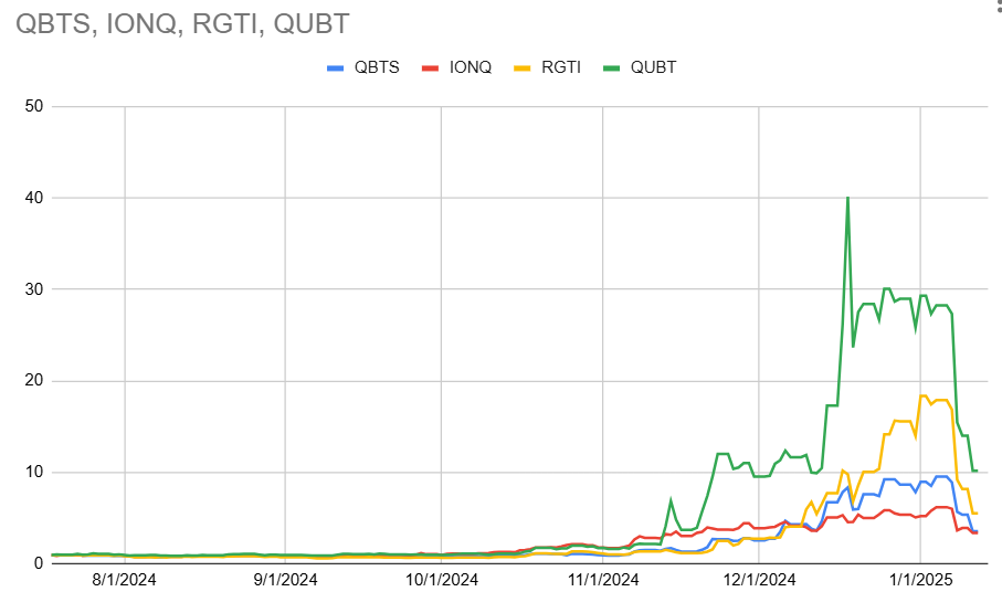 We made a significant profit on our last D-Wave trade, buying at $1.10 and selling at $8.02, making it the most profitable trade of 2024. I want to invest in D-Wave again because I believe it is substantially undervalued at today's price of $4.12. However, there's a concern regarding the movement of all quantum stocks, as they seem to be moving in tandem. The graph below illustrates this trend: they all surged together and are now experiencing a collective decline.