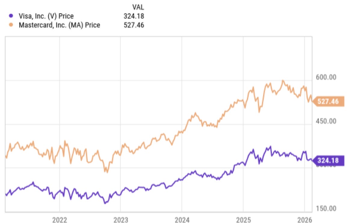 You can see the correlation just by looking at the chart; the two stocks are moving together with near-identical peaks and troughs. It is a real correlation with causation; they have a near duopoly on payment processing, and they take a fee every time someone pays with a card, so their incomes rise and fall with the number of payments made.