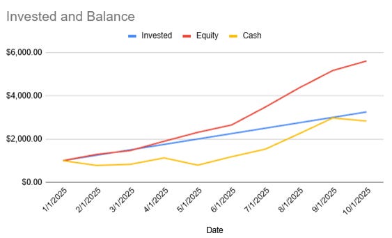 Following this plan would have led to a profit of $2,357 by the first of October and the total investment would have been $3,000, a 78% return. The cash balance would have been $2,829 (after the October $250), allowing position size to double to $200.