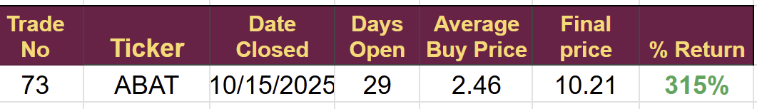 We booked a big profit closing ABAT just before the big sell-off and managed to maximize our return. It is the second week in a row we have booked a triple-digit percentage gain.