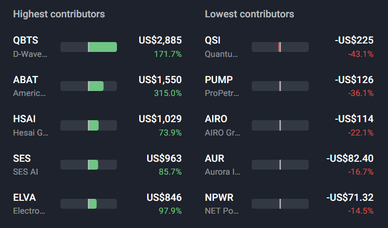 “SES up 262% in total, up 22% since your close. Qbts up 2365% in total, up 74% since last close…... Onds up 410% in total, 91% since close. Joby up 177% in total, 6% since close, Npwr still down 15% in total but coming back, Leu up 967% in total, not sure when you exited, Genius up 74% in total, again not sure when exited”
