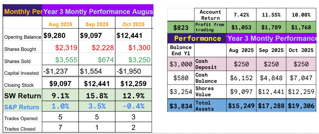 The account as a whole remains above target; we need a compound average return of 5.2% per month to reach the target, and October is currently showing 10%.